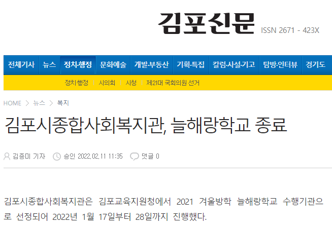 - [김포신문] 김포시종합사회복지관, 늘해랑학교 종료.PNG (27.2K) 18회 다운로드DATE : 2022-02-14 09:08:26