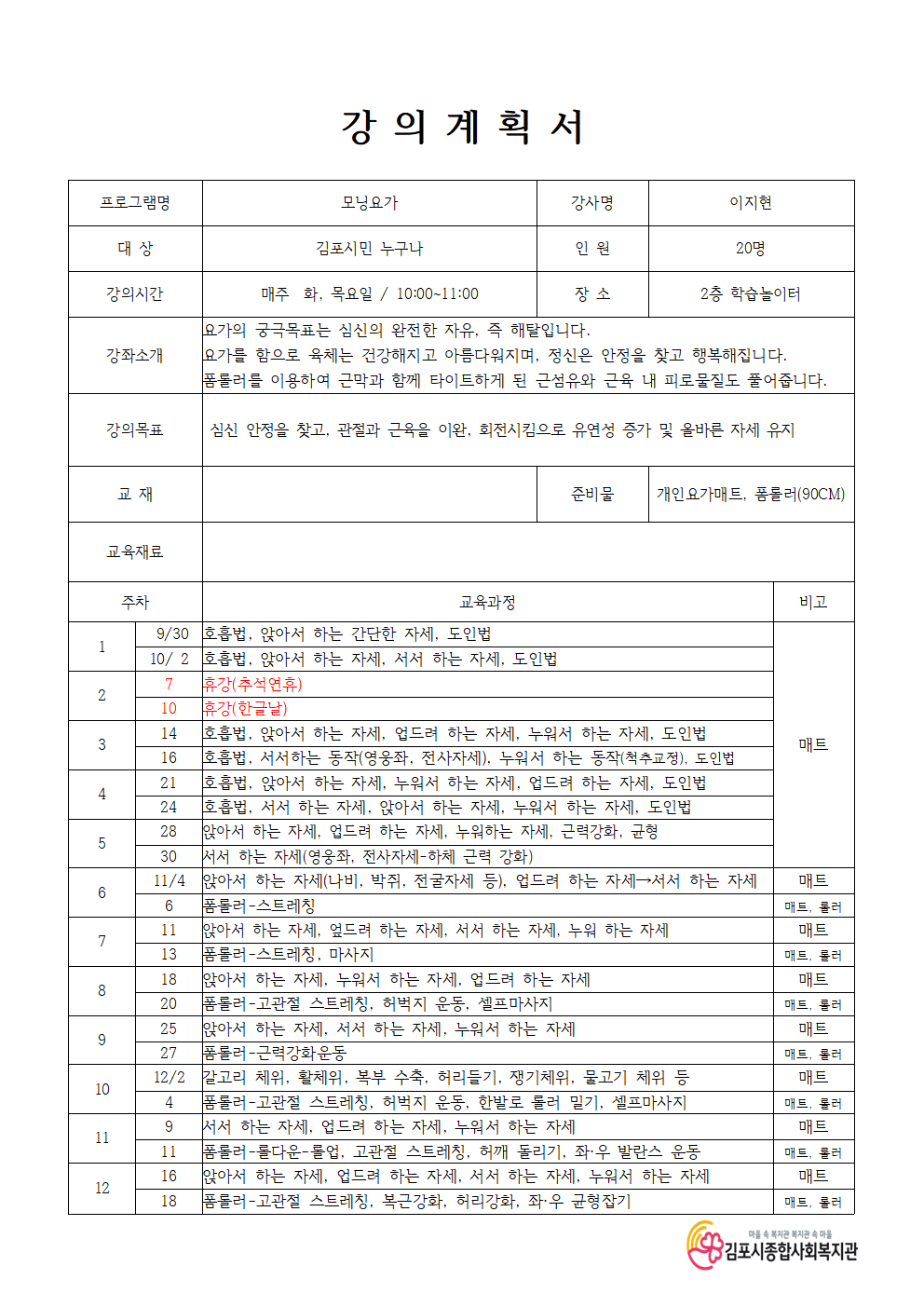 10:00 ~ 11:00 (매주 화요일, 목요일)