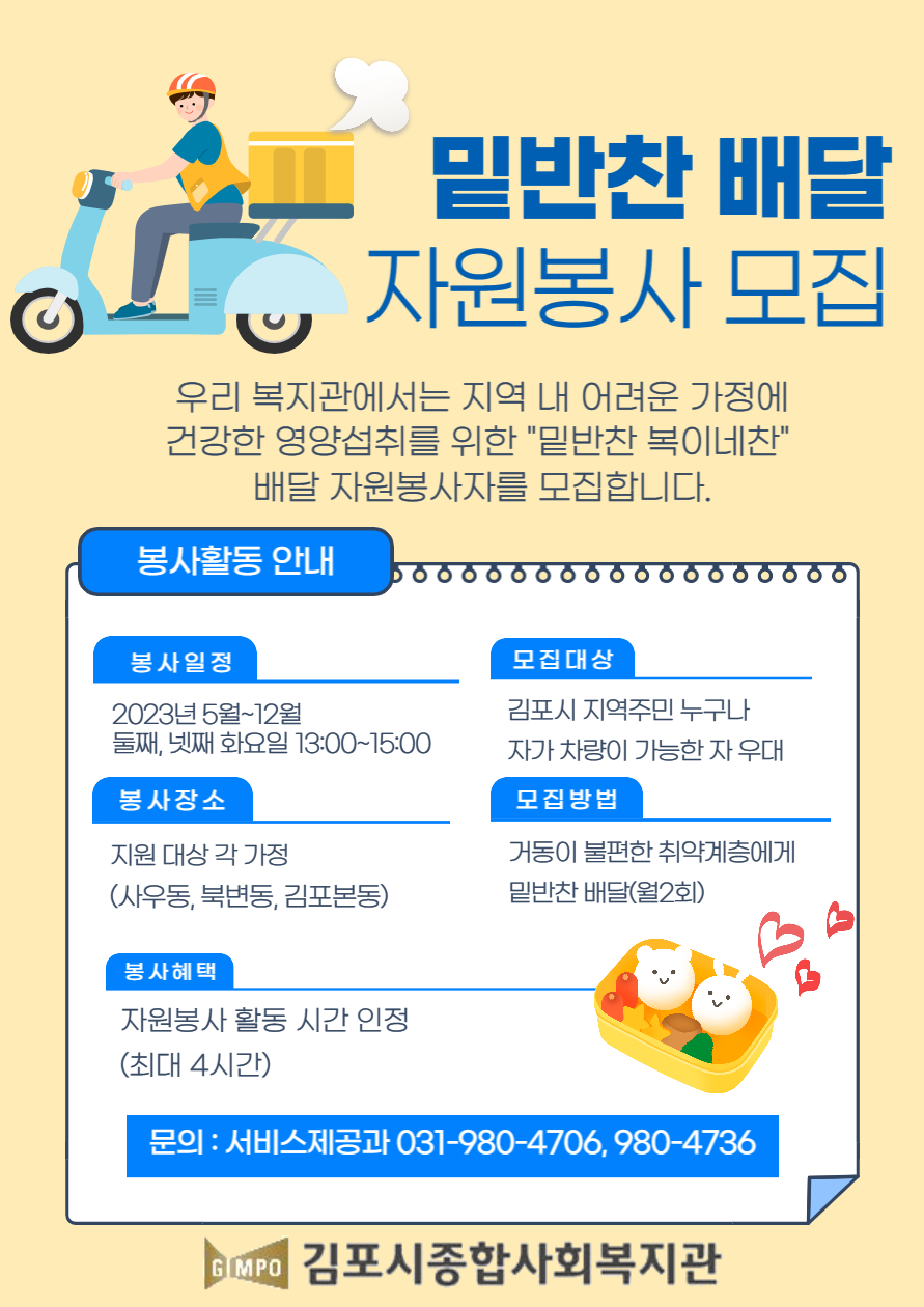 월 2회, 둘째, 넷째 화요일 오후에 사우동, 북변동, 걸포동에 있는 취약계층에게 밑반찬을 배달해 주실 봉사자를 모집합니다.