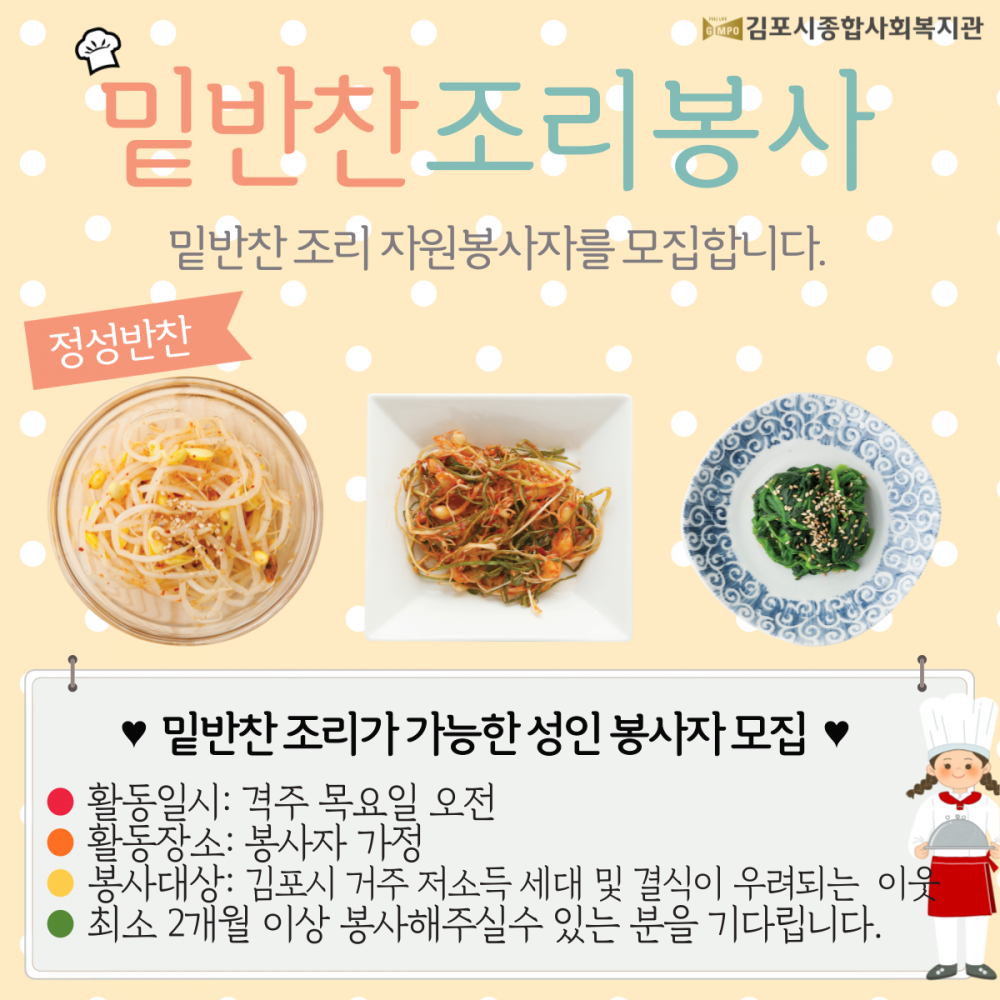 모집완료 [마감되었습니다.] 밑반찬 조리 자원봉사자 모집(성인)