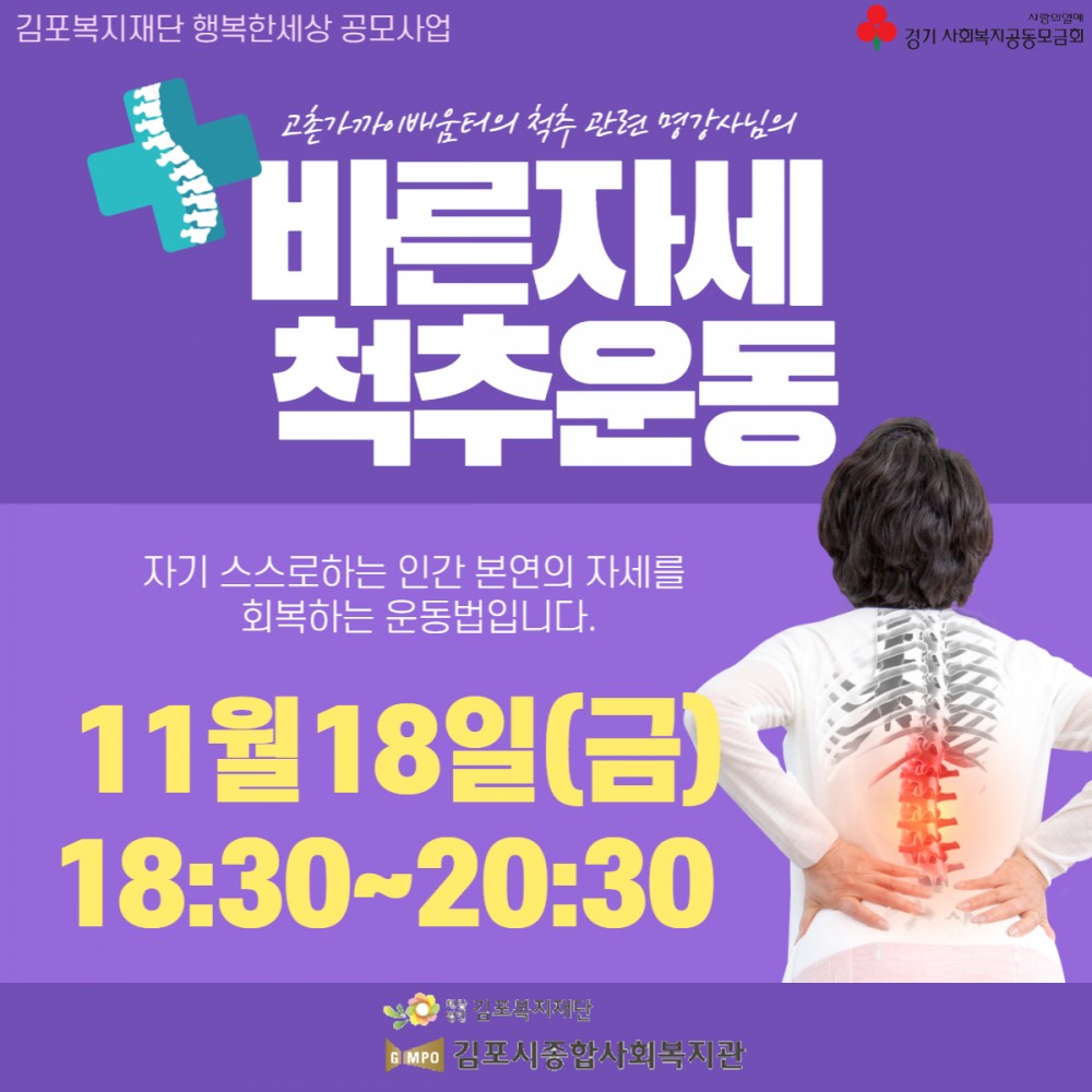프린트 목록 모집완료 1인가구지원사업 건강 플러스 "바른자세 척추운동" 페이지 정보 김포시종합사회복지관 조회 870 입력 2022-11-16 17:48 댓글 0 본문 1인 가구를 위한 사업입니다. 첨부파일 척추운동-001.jpg (565.9K) 33회 다운로드DATE : 2022-11-16 17:48:04 프린트 목록 이전글2022 동계 on마을축제 진행합니다 2022.11.21 다음글환경이슈, 제로웨이스트를 배우고 실천하는 '환승-에코' 2022.11.14 댓글 0 댓글목록 등록된 댓글이 없습니다.