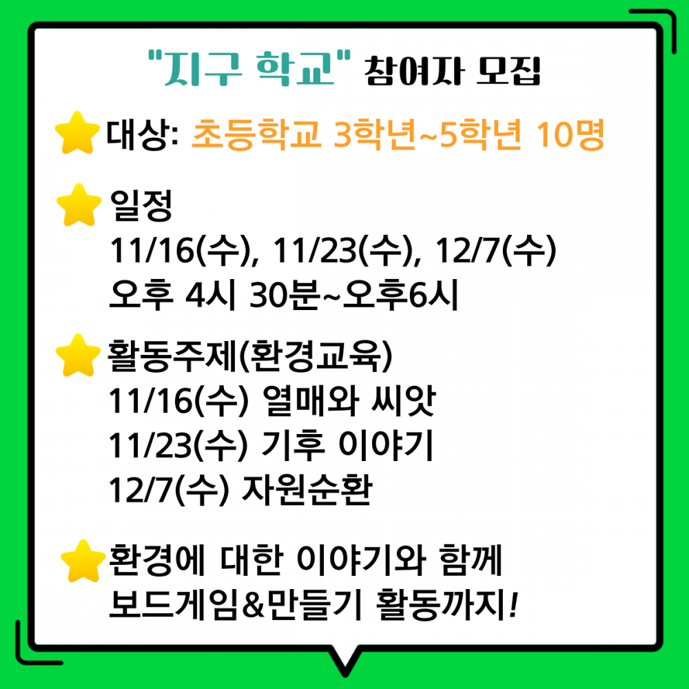모집완료 놀면서 배우는 우리아이 환경교육 "지구 학교" 참여자 모집!