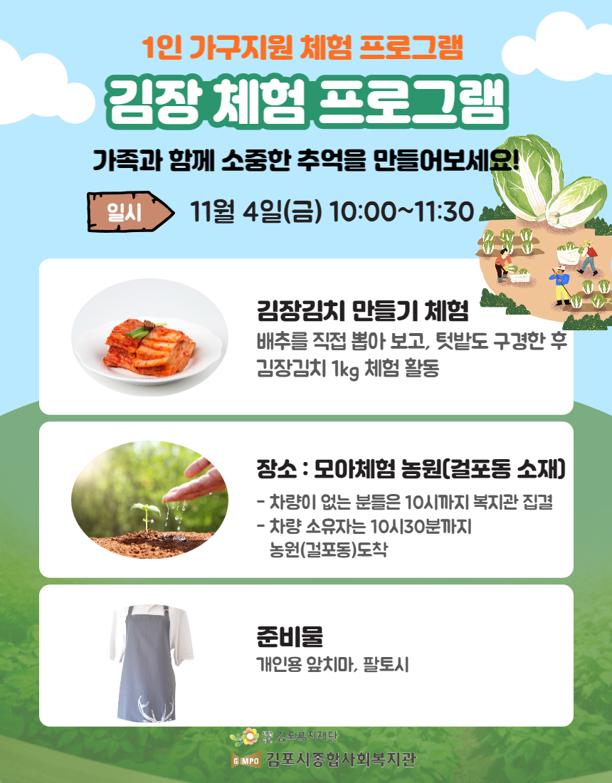 모집완료 1인가구지원사업 김장김치 체험 안내