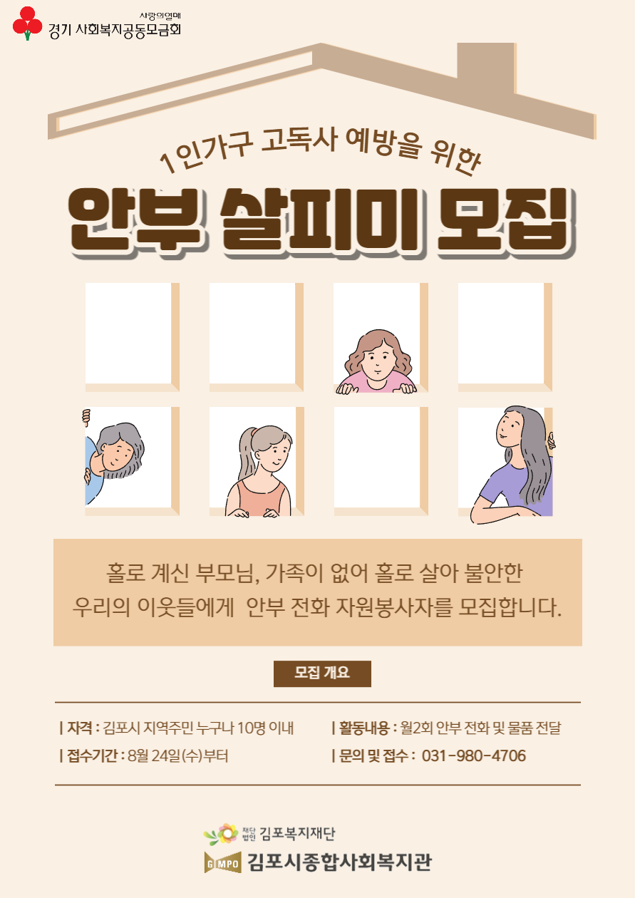 프린트 목록 모집완료 1인 가구 고독사 예방을 위한 안부 전화 자원봉사자 모집 페이지 정보 김포시종합사회복지관 조회 899 입력 2022-08-23 14:24 댓글 0 본문 활동한 부분에 대한 자원봉사 인증시간이 발급 됩니다. 첨부파일 안부 살피미 모집-001.jpg (355.5K) 38회 다운로드DATE : 2022-08-23 14:24:10 프린트 목록 이전글보드랑역사랑(초등3~4학년) 참여자 모집 중 2022.08.29 다음글방과 후 마을학교 2기 참여자 모집(초등학생) 2022.08.10 댓글 0 댓글목록 등록된 댓글이 없습니다.