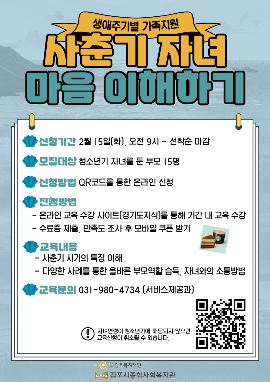프린트 목록 모집완료 생애주기별 가족지원 <사춘기 자녀 마음 이해하기> 페이지 정보 김포시종합사회복지관 조회 1,018 입력 2022-02-15 08:20 댓글 0 본문 신청링크 : https://forms.gle/aokf63z5VnJSESVLA 첨부파일 사춘기 자녀 마음 이해하기 홍보지.jpg (274.3K) 26회 다운로드DATE : 2022-02-15 08:20:48 프린트 목록 이전글2022년 2분기(4~6월) 교육문화 프로그램 수강생 모집 2022.03.15 다음글2022년 복지관 설문조사 2022.02.04 댓글 0 댓글목록 등록된 댓글이 없습니다.