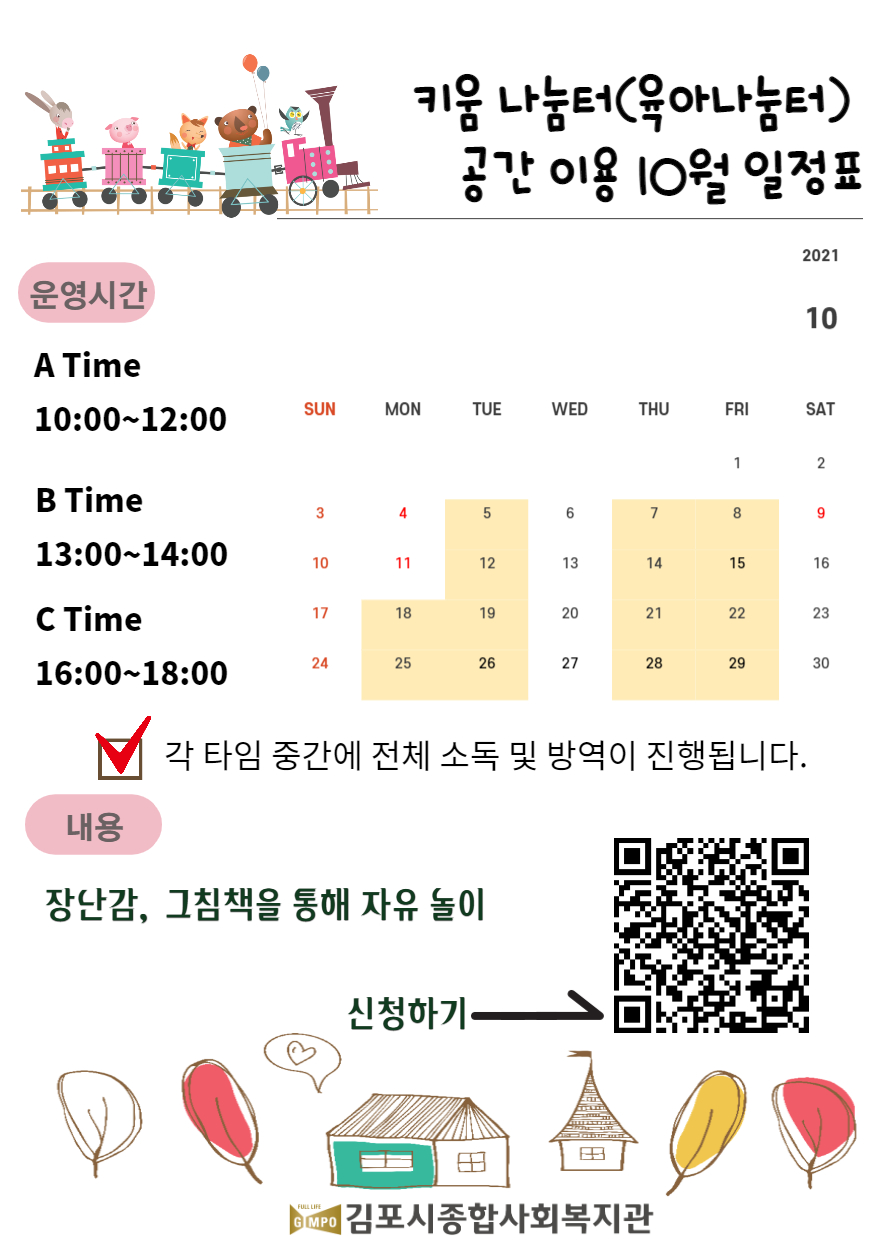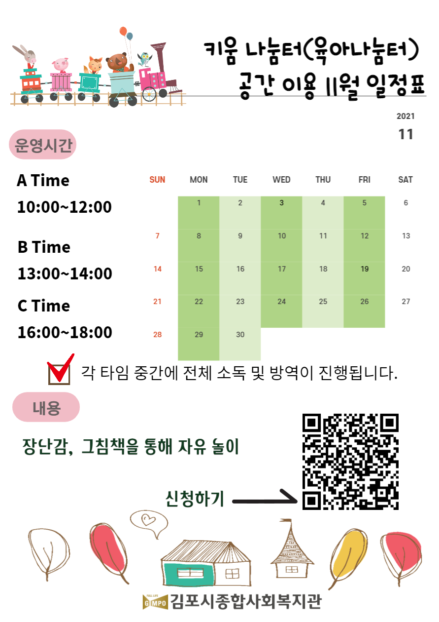 ★키움나눔터 이용기간 : 10/4~11/30 매주 월, 화, 수, 목 10시, 13시, 16시 / 시간별 2가정 / 무료