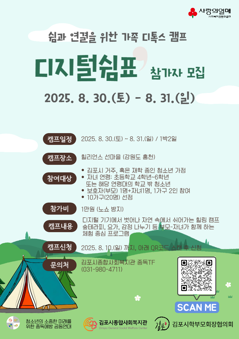 디지털 기기 사용에 어려움을 겪고 있는 청소년 가정을 위한 1박 2일 가족캠프 『디지털쉼표』의 참가자를 모집합니다.