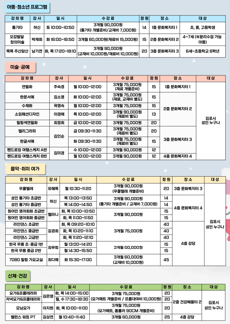 김포시종합사회복지관에서 진행되는 교육문화 프로그램은 1년 4분기로 나누어 진행되며