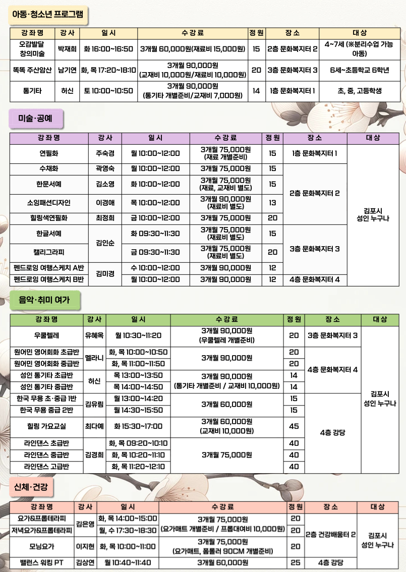 김포시종합사회복지관에서 진행되는 교육문화 프로그램은 1년 4분기로 나누어 진행되며