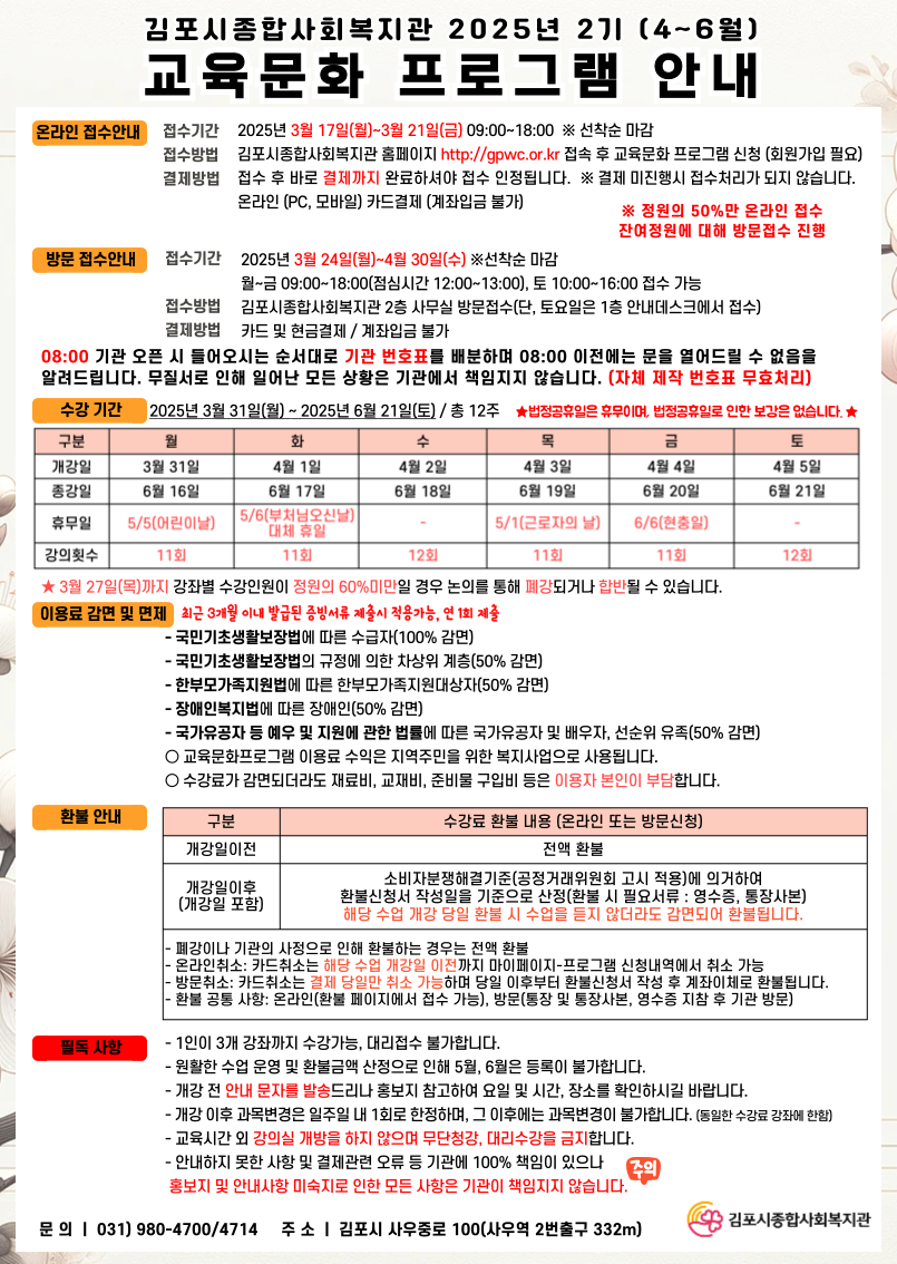 2025년 2기(4~6월) 교육문화 프로그램 수강상을 모집합니다.
