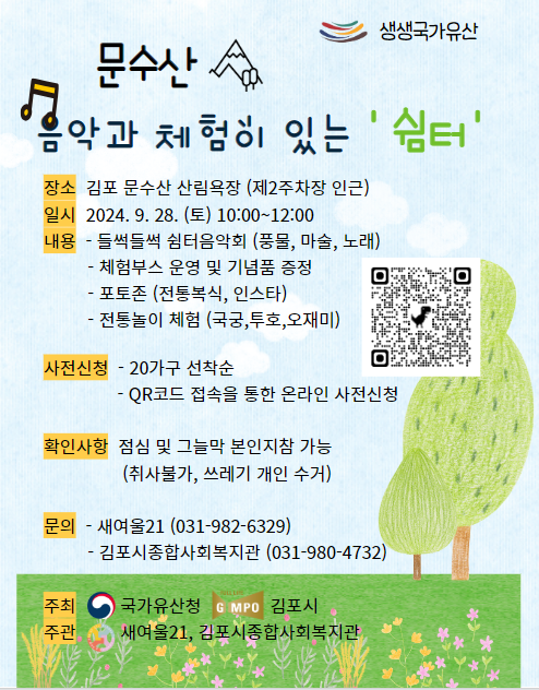 9월 28일 토요일 월곶 문수산 산림욕장에서 음악과 체험이 있는 '쉼터' 프로그램을 진행합니다.????