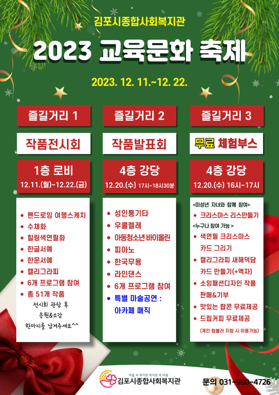 -내용 : 크리스마스 리스 만들기, 색연필 크리스마스 카드그리기, 캘리그라피 새해덕담 카드 만들기(액자제공), 소잉패션디자인 작품 판매&기부, 팝콘나눔, 드립커피 나눔(개인 텀블러 지참 시 이용가능)