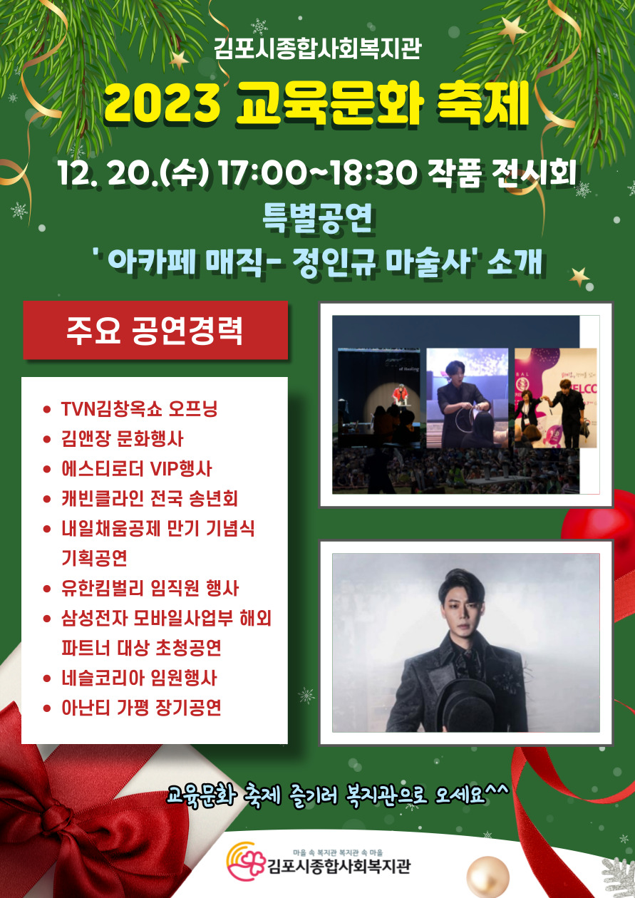-내용 : 피아노, 아동청소년 바이올린, 성인통기타, 우쿨렐레, 라인댄스, 한국무용 수강생 작품 발표 및 특별 마술공연