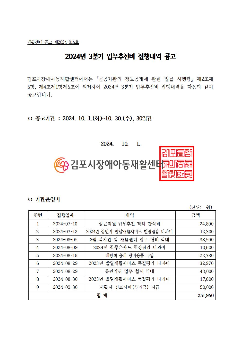 2024년 3분기 업무추진비 집행내역 공고