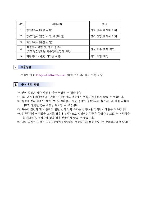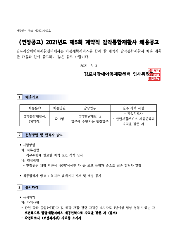 [연장공고] 김포시장애아동재활센터 계약직 감각발달재활사 채용 공고