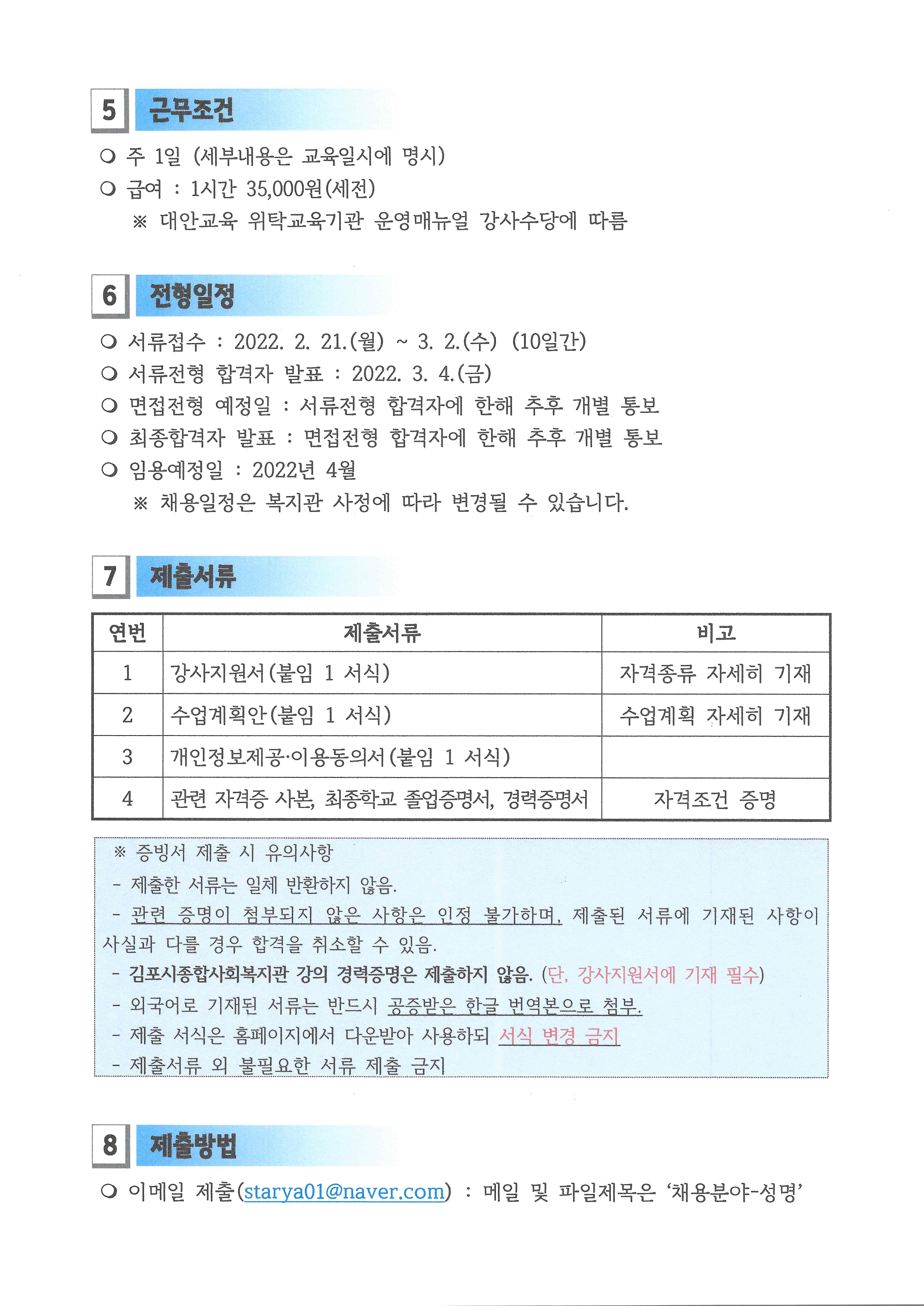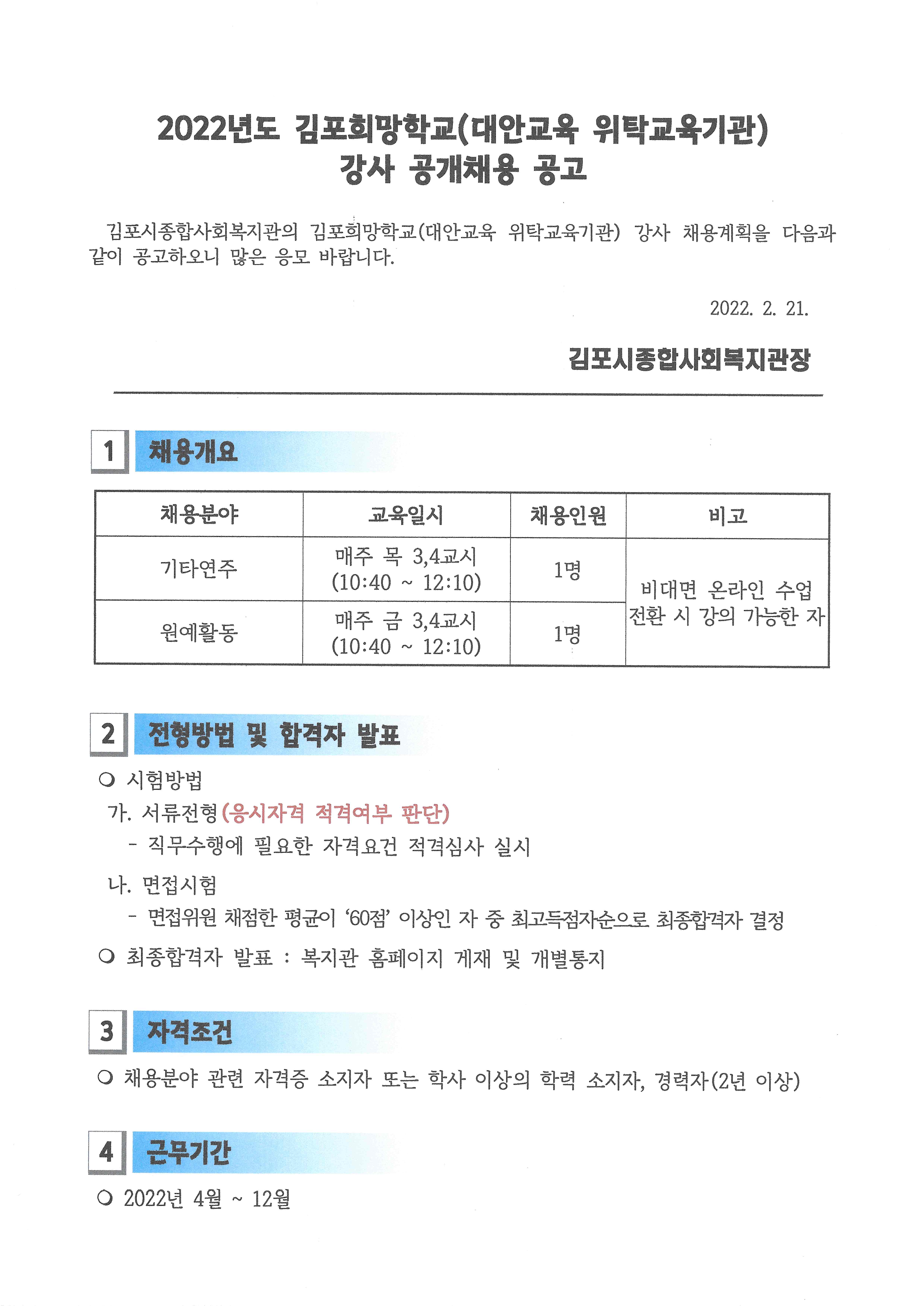 2022학년도 김포희망학교(대안교육 위탁교육기관) 신규 강사 채용 공고