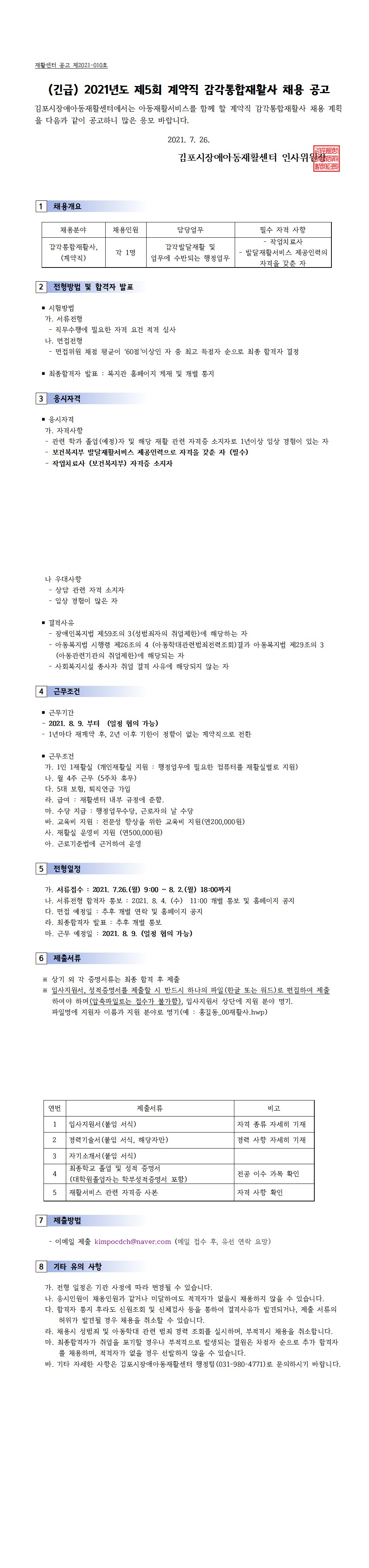 [긴급채용] 김포시장애아동재활센터 계약직 감각발달재활사 채용 공고