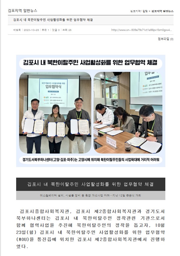 - 다음글[경인열린신문] 김포시 내 북한이탈주민 사업활성화를 위한 업무협약 체결 2023.11.22