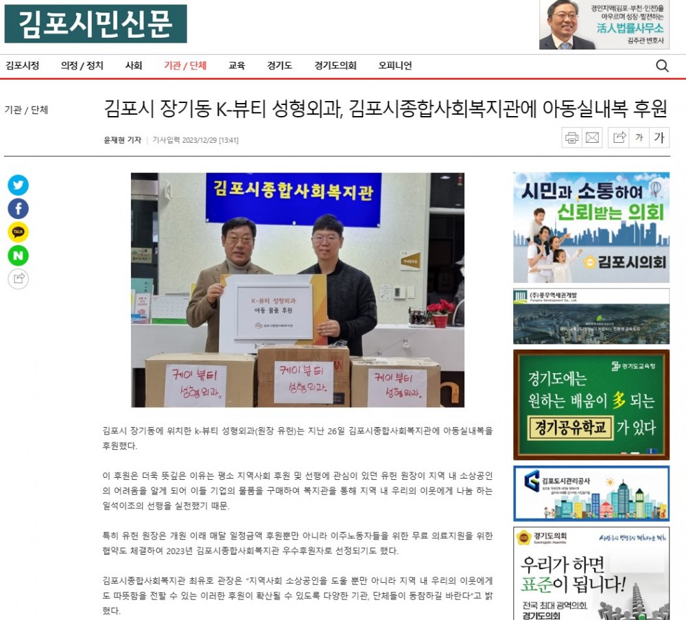 [김포시민신문] 김포시 장기동 K-뷰티 성형외과, 김포시종합사회복지관에 아동실내복 후원