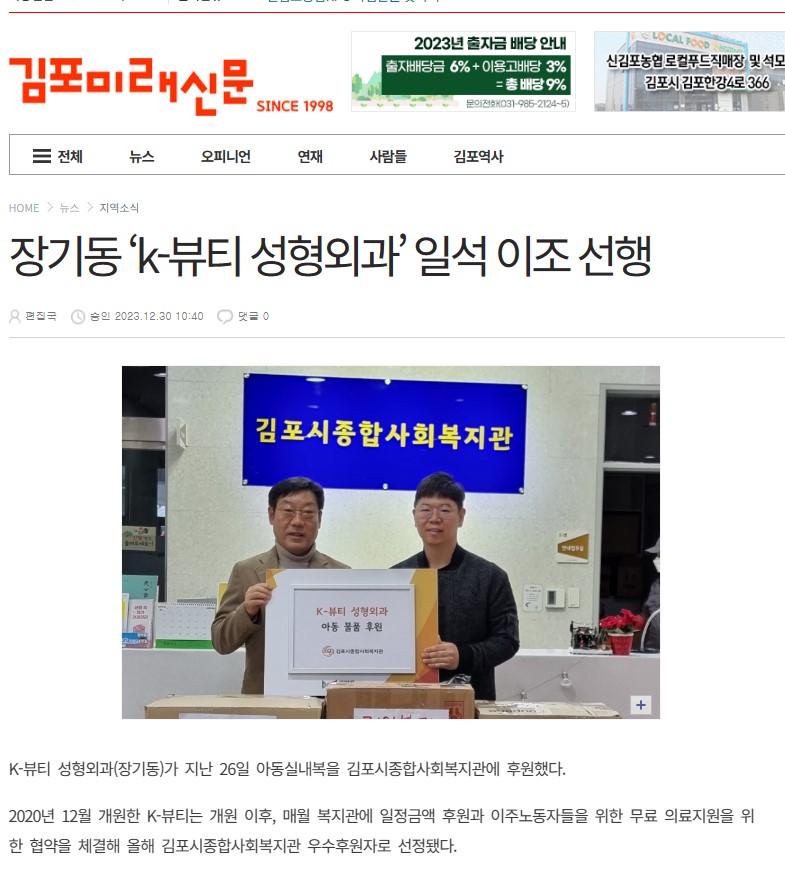 - 다음글[김포시민신문] 김포시 장기동 K-뷰티 성형외과, 김포시종합사회복지관에 아동실내복 후원 2024.01.09