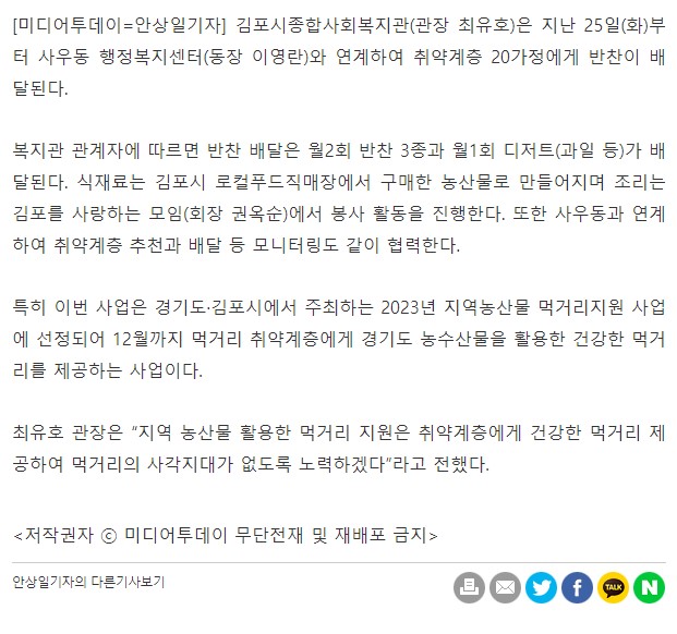 [미디어투데이] 김포시종합사회복지관, 사우동 행정복지센터 ‘복(福)이네반찬’ 배달 시작