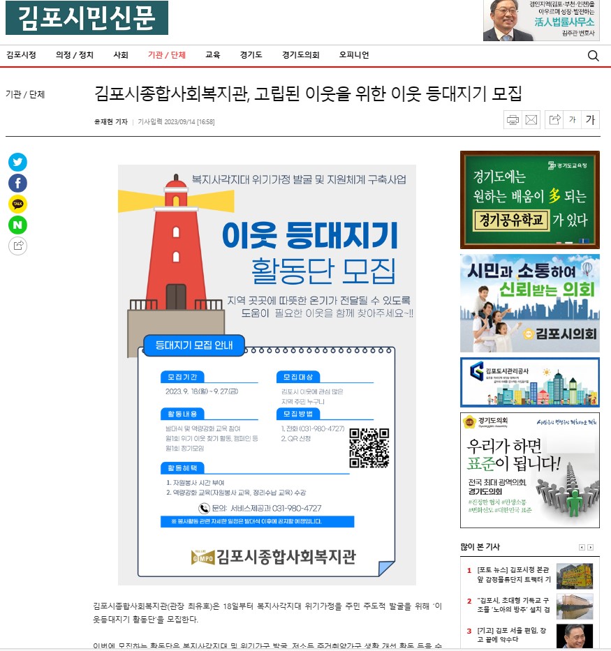 - 김포시민신문_이웃 등대지기 활동단 모집.jpg (183.1K) 10회 다운로드DATE : 2023-11-22 15:51:03