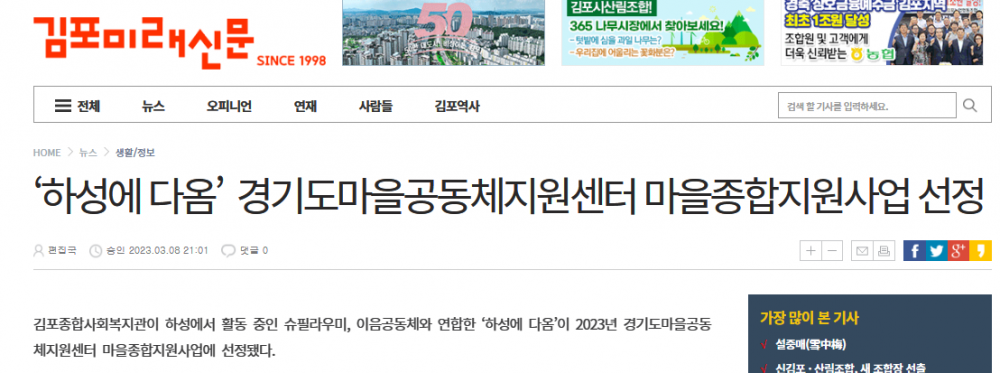 - [김포미래신문] 하성에 다옴 경기도마을공동체지원센터 마을종합지원사업 선정.png (180.3K) 26회 다운로드DATE : 2023-03-13 15:14:40