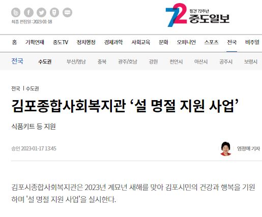 - [중도일보] 김포시종합사회복지관 설명절지원사업 실시.JPG (35.6K) 30회 다운로드DATE : 2023-01-19 09:42:31