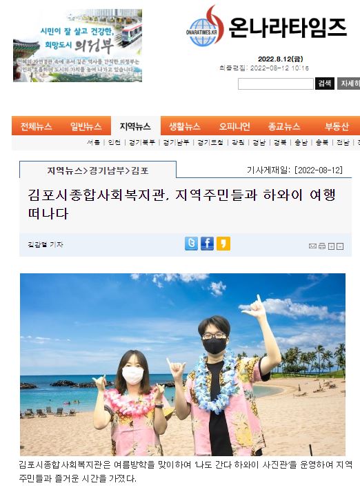 - [온나라타임즈] 김포시종합사회복지관, 지역주민들과 하와이 여행 떠나다.JPG (77.2K) 28회 다운로드DATE : 2022-08-12 10:23:15