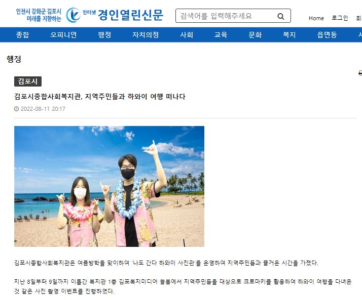 - 다음글[온나라타임즈] 김포시종합사회복지관, 지역주민들과 하와이 여행 떠나다 2022.08.12