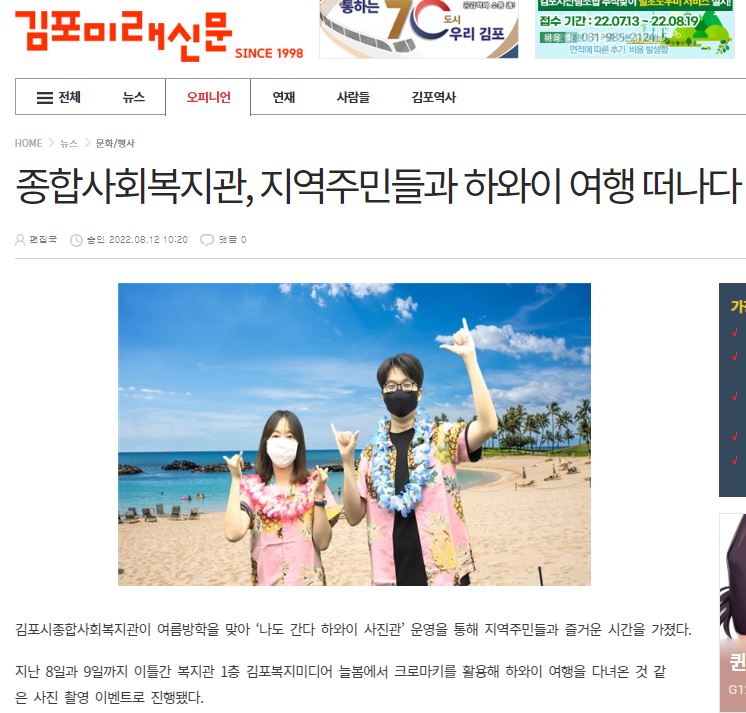 - 다음글[경인열린신문] 김포시종합사회복지관, 지역주민들과 하와이 여행 떠나다 2022.08.12