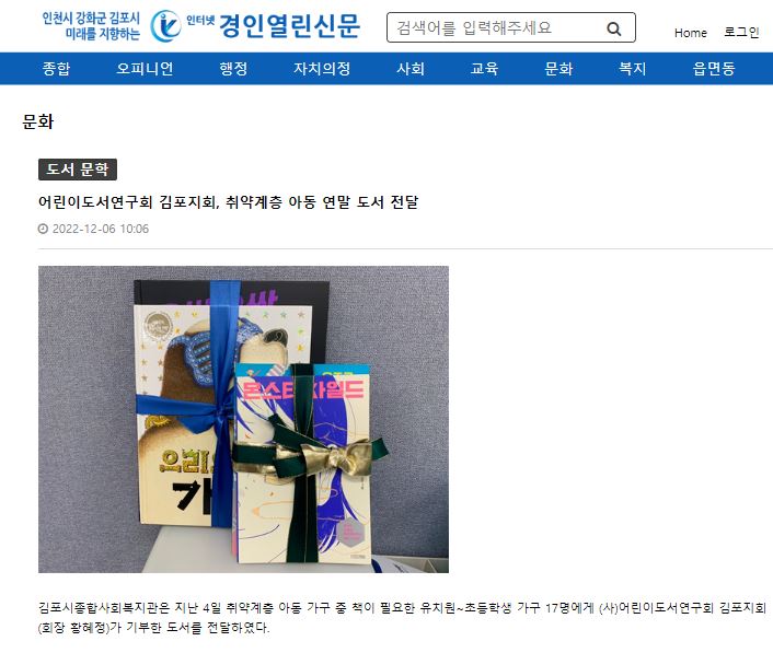 - [경인열린신문] 어린이도서연구회 김포지회, 취약계층 아동 연말 도서 전달.JPG (66.2K) 26회 다운로드DATE : 2022-12-07 15:59:55