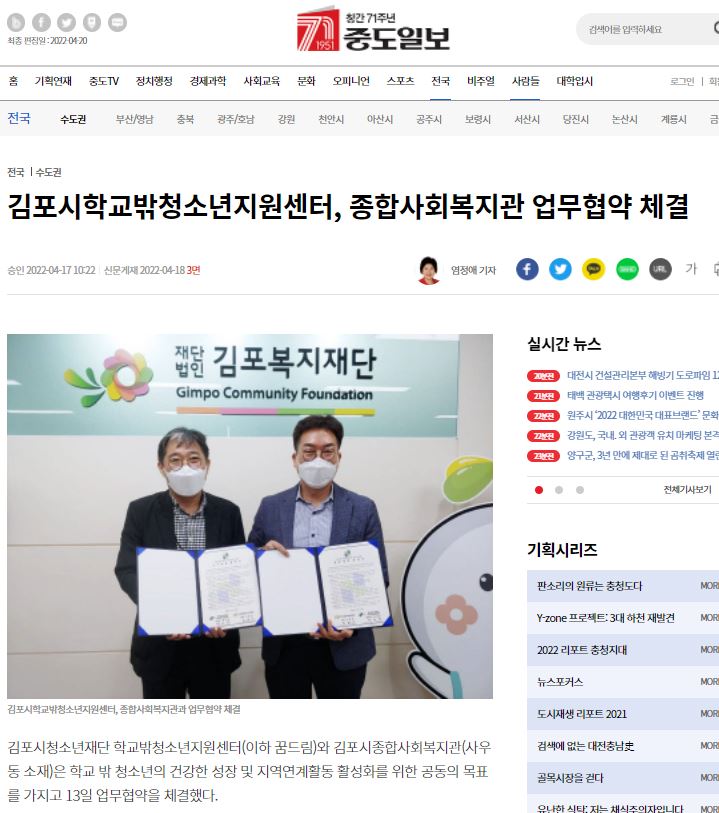 - [중도일보] 김포시학교밖청소년지원센터-종합사회복지관, 업무협약.JPG (97.4K) 28회 다운로드DATE : 2022-04-20 10:25:13