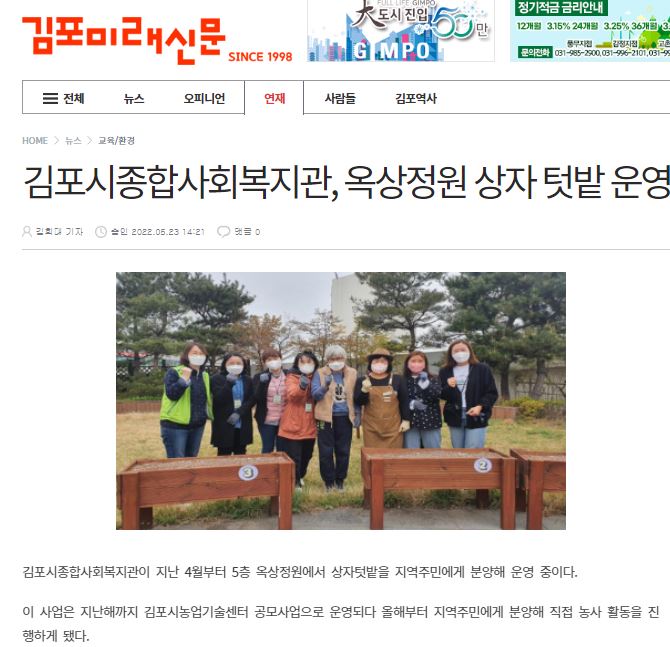 - [김포미래신문] 김포시종합사회복지관, 옥상정원 상자텃밭 운영.JPG (79.2K) 31회 다운로드DATE : 2022-05-23 17:46:29