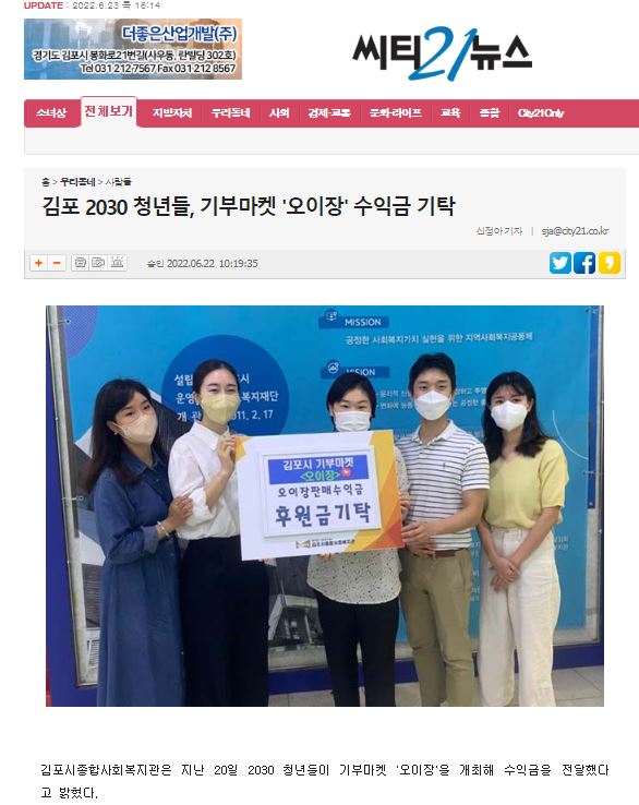 - [씨티21뉴스] 김포 2030 청년들 기부마케 오이장 수익금 기탁.JPG (74.4K) 31회 다운로드DATE : 2022-06-24 10:13:39