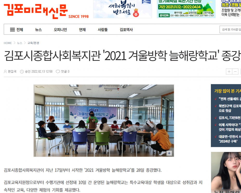 - [김포미래신문] 김포시종합사회복지관, 2021 겨울방학 늘해랑학교 종강.PNG (654.2K) 19회 다운로드DATE : 2022-02-14 09:07:58