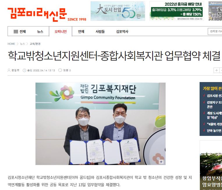 - [김포미래신문] 학교밖청소년지원센터-종합사회복지관, 업무협약.JPG (82.0K) 25회 다운로드DATE : 2022-04-20 10:22:55