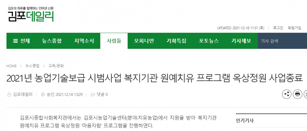 - [김포데일리] 2021년 농업기술보급 시범사업 복지기관 원예치유프로그램 옥상정원 사업종료.PNG (36.5K) 19회 다운로드DATE : 2021-12-20 10:19:44