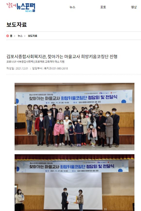 - [김포시뉴스포털] 김포시종합사회복지관, 찾아가는 마을교사 희망키움코칭단 진행.JPG (75.4K) 19회 다운로드DATE : 2021-12-06 16:31:41