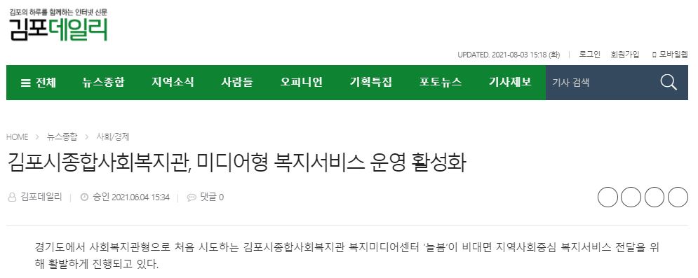 - 다음글[김포신문] 김포복지미디어센터 늘봄, 미디어로 복지서비스 전달 2021.06.09