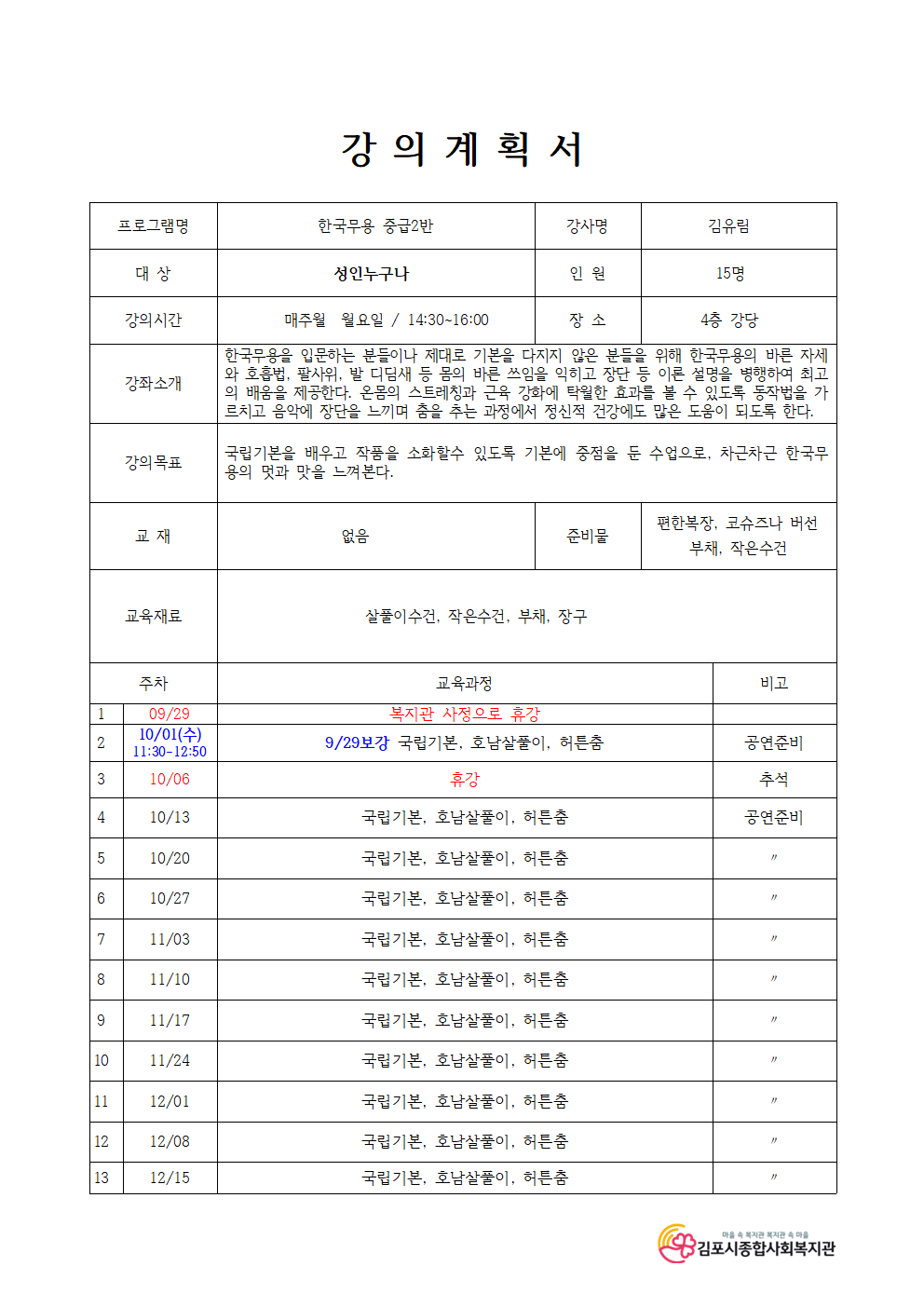※9/29(월)은 복지관사정으로 휴강입니다. 보강은 10/1(수)11:30~12:50 입니다. 첫수업이 10/1(수) 오전이니 참고바랍니다. 이후부터는 기존과 동일하게 매주 월요일 14:30~15:50입니다. 참고바랍니다