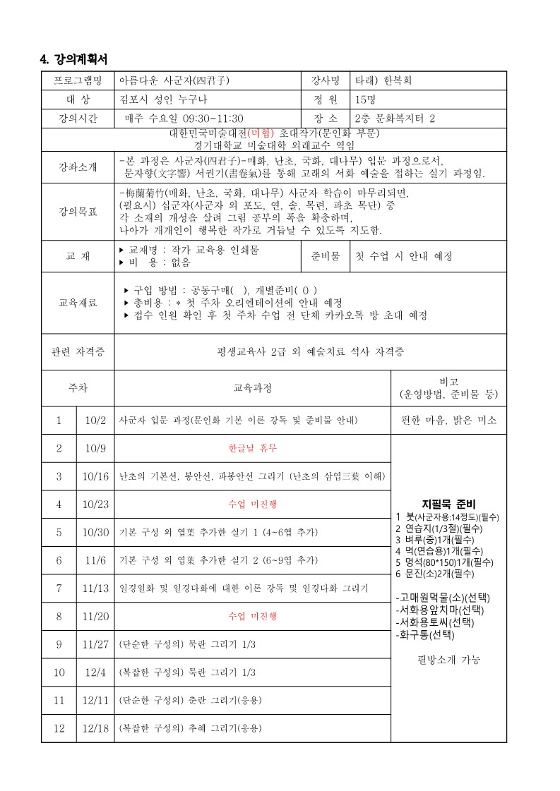 (특강) 아름다운 사군자는 총 10주 진행으로 10/23, 11/20은 강의가 없습니다.
