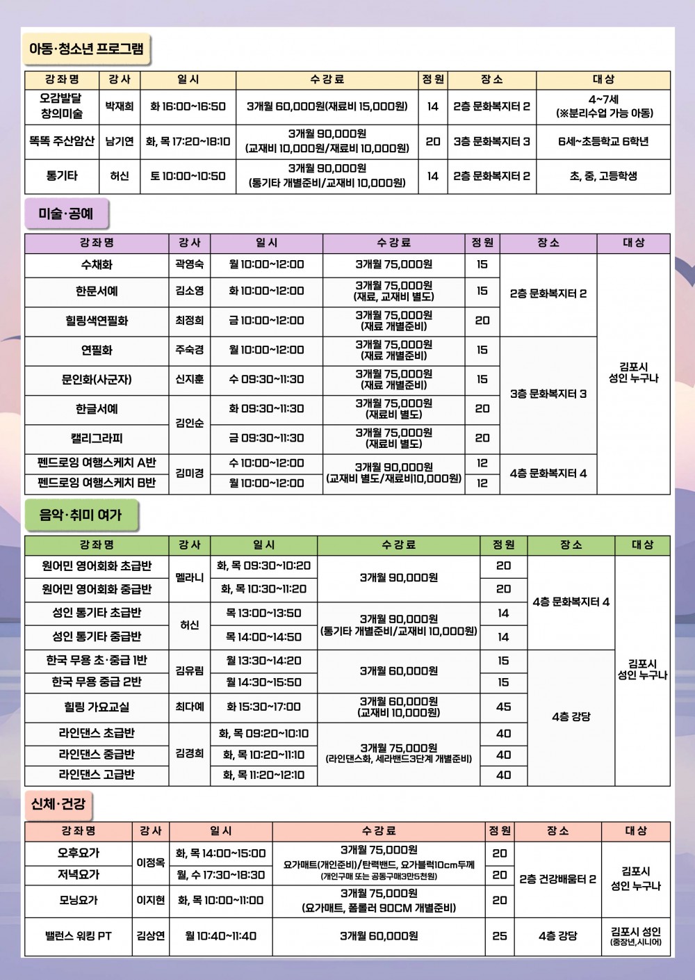 ○접수방법: 김포시종합사회복지관 홈페이지 접속 후 교육문화 프로그램 신청(회원가입 필요)