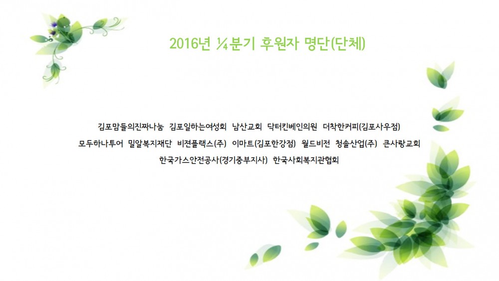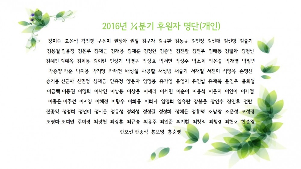프린트 목록 2016년 1/4분기 후원자현황 페이지 정보 관리자 조회 1,102 입력 2016-04-11 15:37 댓글 0 본문 첨부파일 2016년 후원자 (단체).jpg (126.1K) 19회 다운로드DATE : 2016-04-11 15:37:43 2016년 후원자명단(개인).jpg (291.7K) 19회 다운로드DATE : 2016-04-11 16:27:52 프린트 목록 이전글2016년 2/4분기 후원자 현황 2016.07.08 다음글한국SGI 김포지역권 목침베개 전달식 2016.03.21 댓글 0 댓글목록 등록된 댓글이 없습니다.