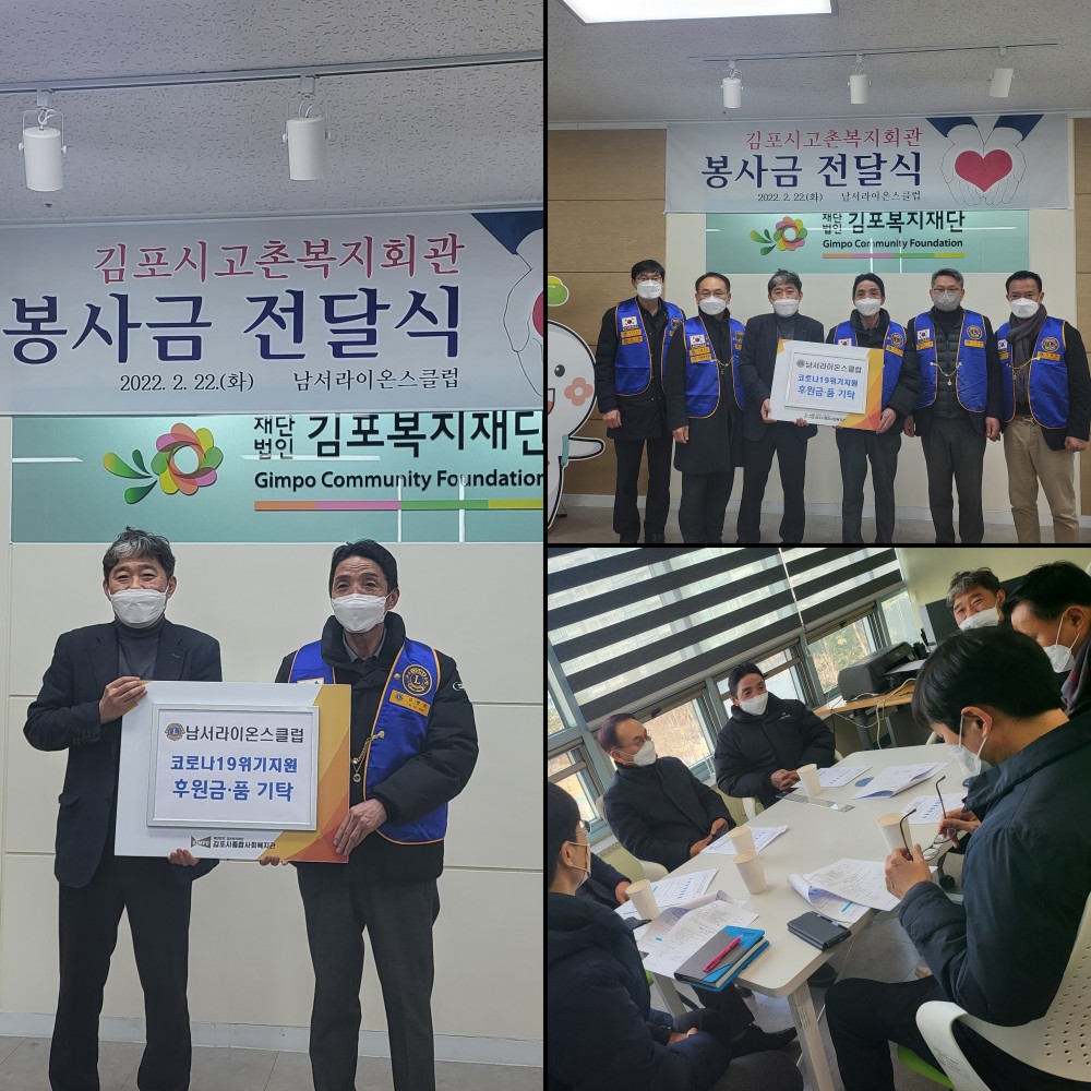 2022년 2월 22일 월요일, 남서라이온스클럽은 김포시종합사회복지관에 오미크론 예방을 위한 물품과 후원금을 전달하였습니다.