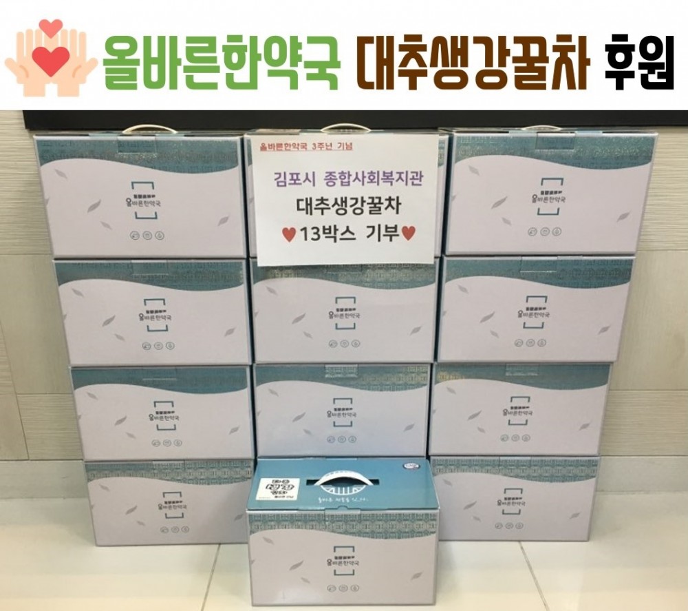 지난 12월 21일 올바른한약국에서는 창립 3주년을 맞이하여 대추생강꿀차를 구매하면 김포시종합사회복지관으로 1박스를 기부하는 형태의 이벤트를 진행하였다고 합니다.