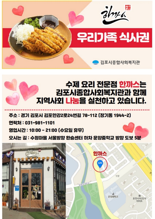 2019년 4월부터 사회공헌활동의 일환으로 김포 장기동에 소재한 수제 돈까스 전문점 \"한까스\"에서 매월 우리가족식사권 2매를 발행하기로 하였습니다.