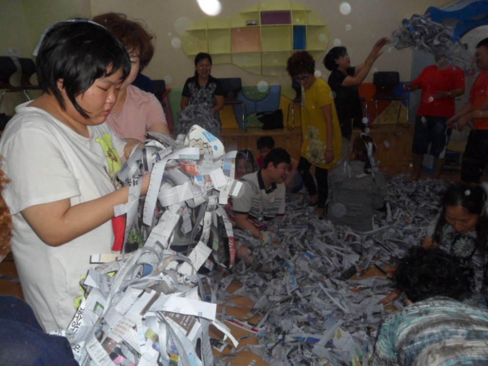 8/28(목) 지역주민 자원봉사자와 1:1 매칭하여 노래와 율동을 배우고, 신문지를 활용한 다양한 레크리에이션 활동에 참여하며 즐거운 시간을 보냈습니다.