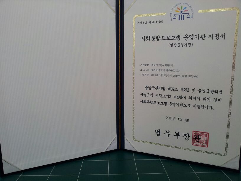 김포시종합사회복지관은 법무부로부터 사회통합프로그램 운영기관으로 지정받았습니다.