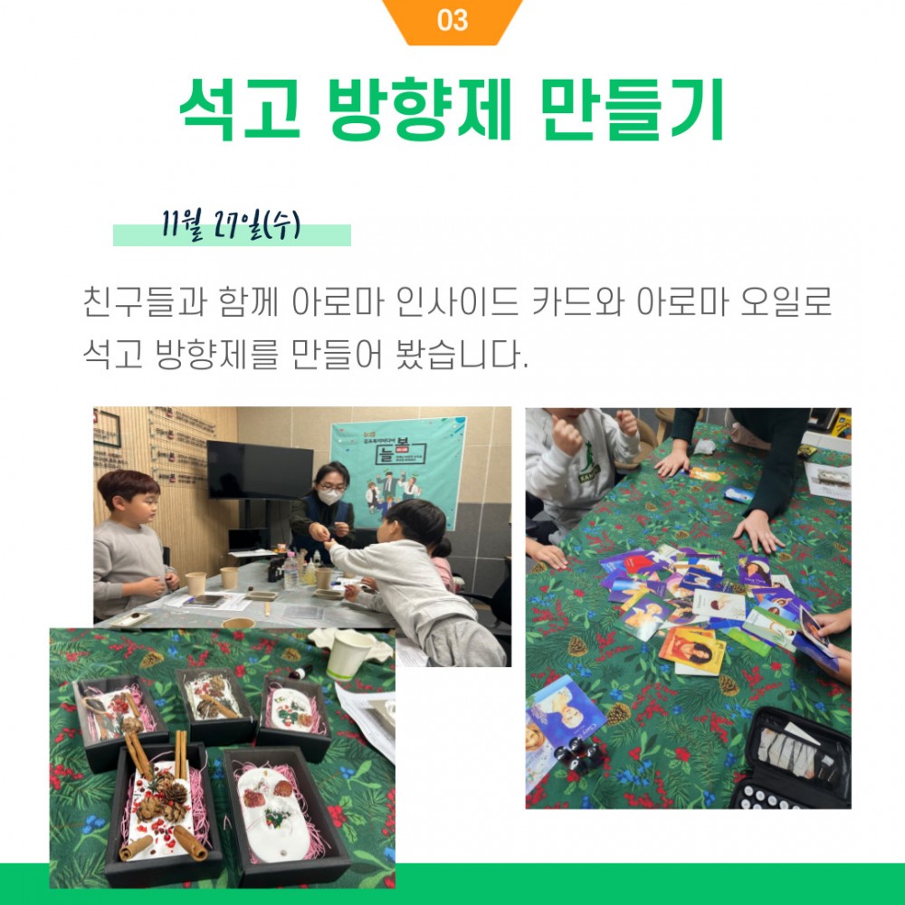 12월에는 연말이라 크리스마스 니스 만들기 등 다양한 활동도 할 예정입니다.